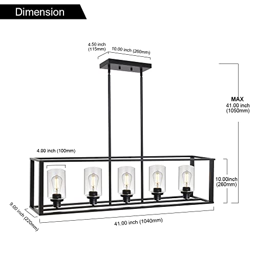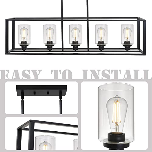 VINLUZ 5 Light Modern Linear Kitchen Island Chandelier Black Finish with Clear Glass Shade Cage Pendant Ligh Hanging for Dining Room Kitchen Island Cafe Bar Restaurant