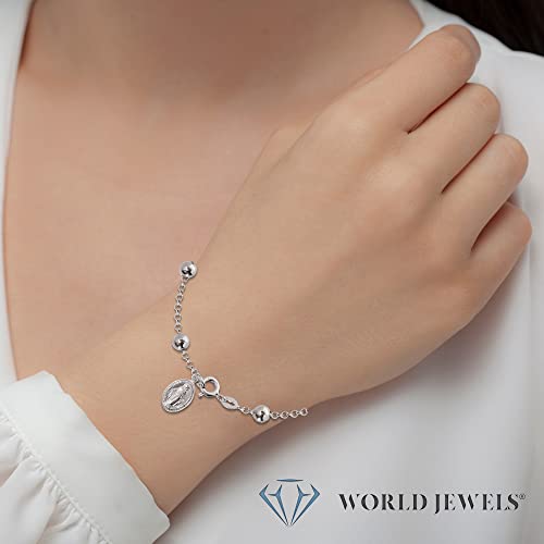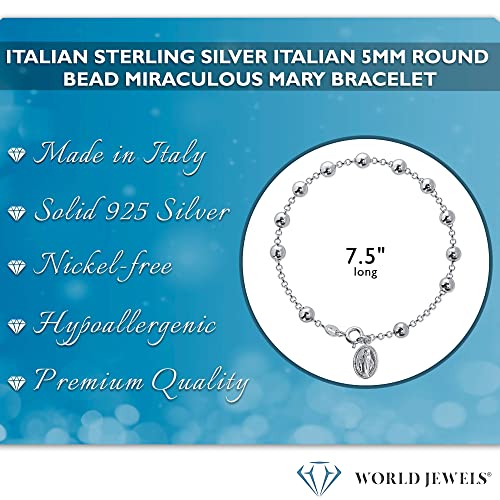 World Jewels 925 Sterling Silver Miraculous Virgin Mary Medal Italian Charm Bracelet – Dainty Christian Presents for Teen Girls, Round Beads Bracelets, Chain Link – Catholic Gifts, Fit 7.5 Inch Wrist