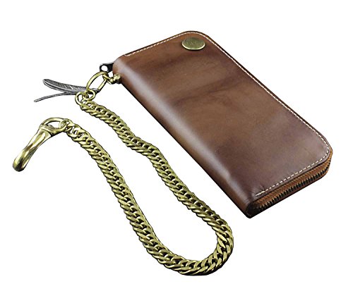 Zipper Chief Head Mens Biker Genuine Leather Wallet With Brass Pants Chain Brown
