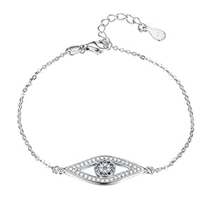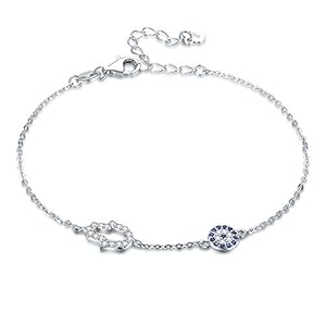 TONGZHE Blue Evil Eye Hamsa Hand Bracelet in Sterling Silver 925 with Cubic Zirconia CZ and 7"+1.5" Cable Chain